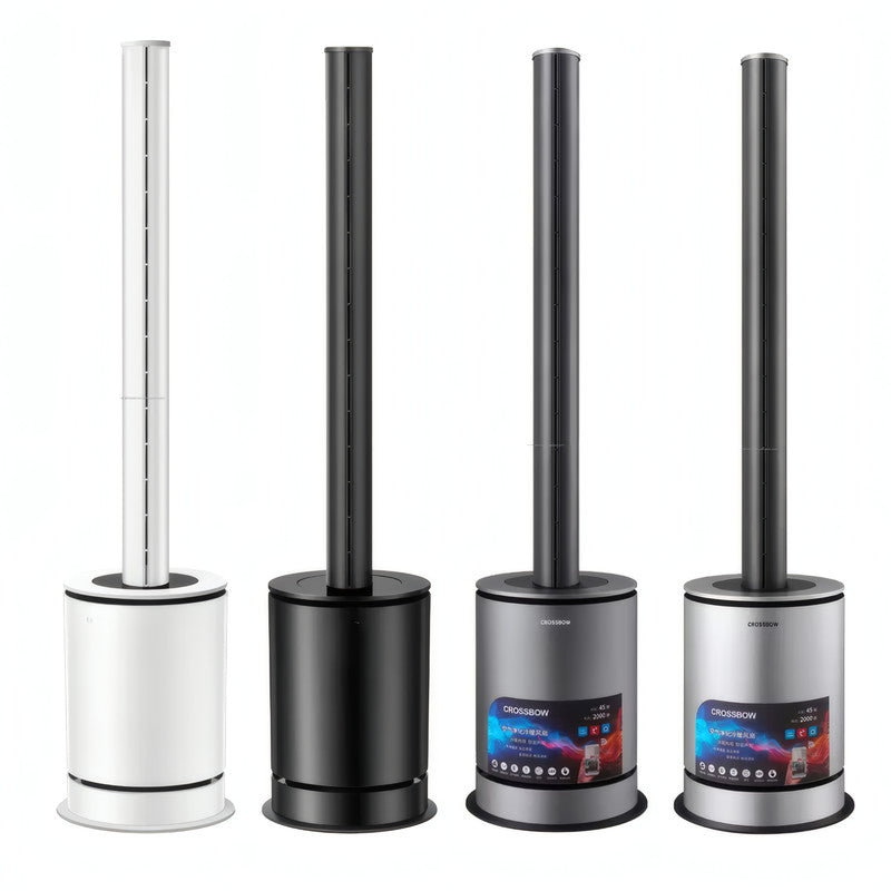 Experience year-round comfort with this versatile 3-in-1 bladeless fan, combining cooling, heating, air purification. The built-in lithium battery allows up to 7.5 hours of cordless operation when using the humidifier. Equipped with a DC motor and invisible blades, it’s safe, quiet, and easy to clean. Features include HEPA filtration, UV sterilization (optional), oscillation up to 80°, aluminium air outlet, 1–9 speeds, sleep/strong mode, timer (1–8h), remote control, digital display, and touch-sensitive panel. Smart home compatibility (Wi-Fi/APP) and voice control via Echo/Google Home are optional. Safety features include automatic shutoff when tipped over and ambient temperature protection for heating.