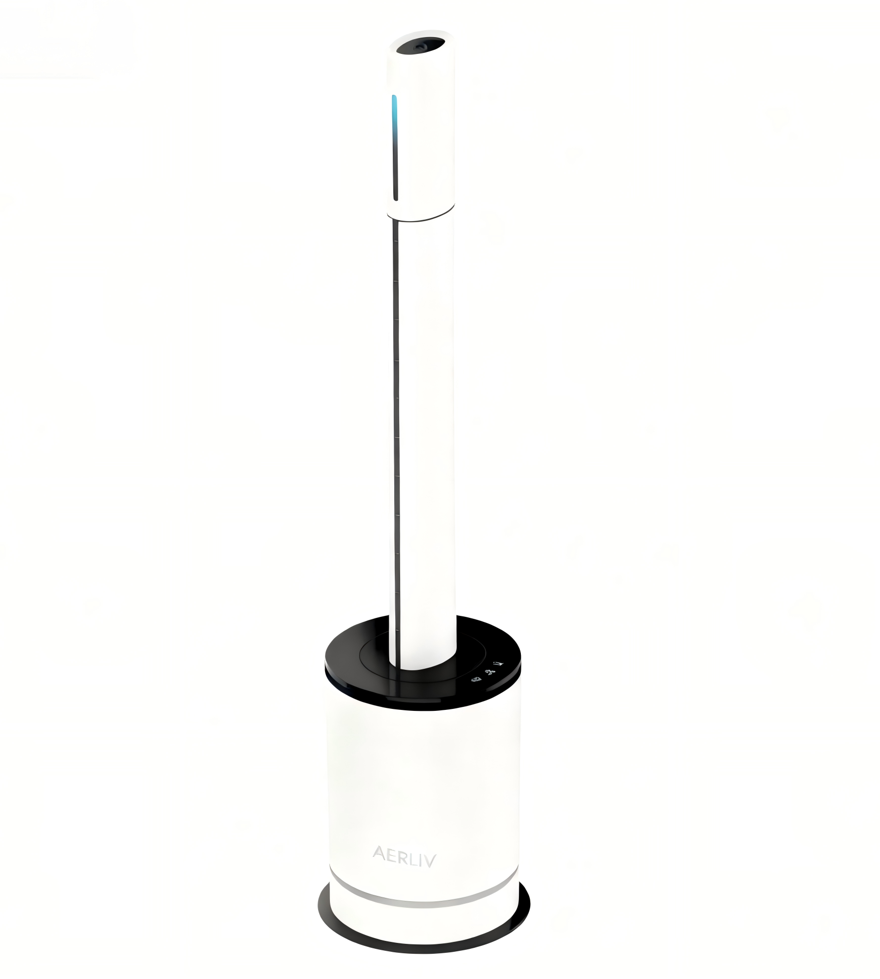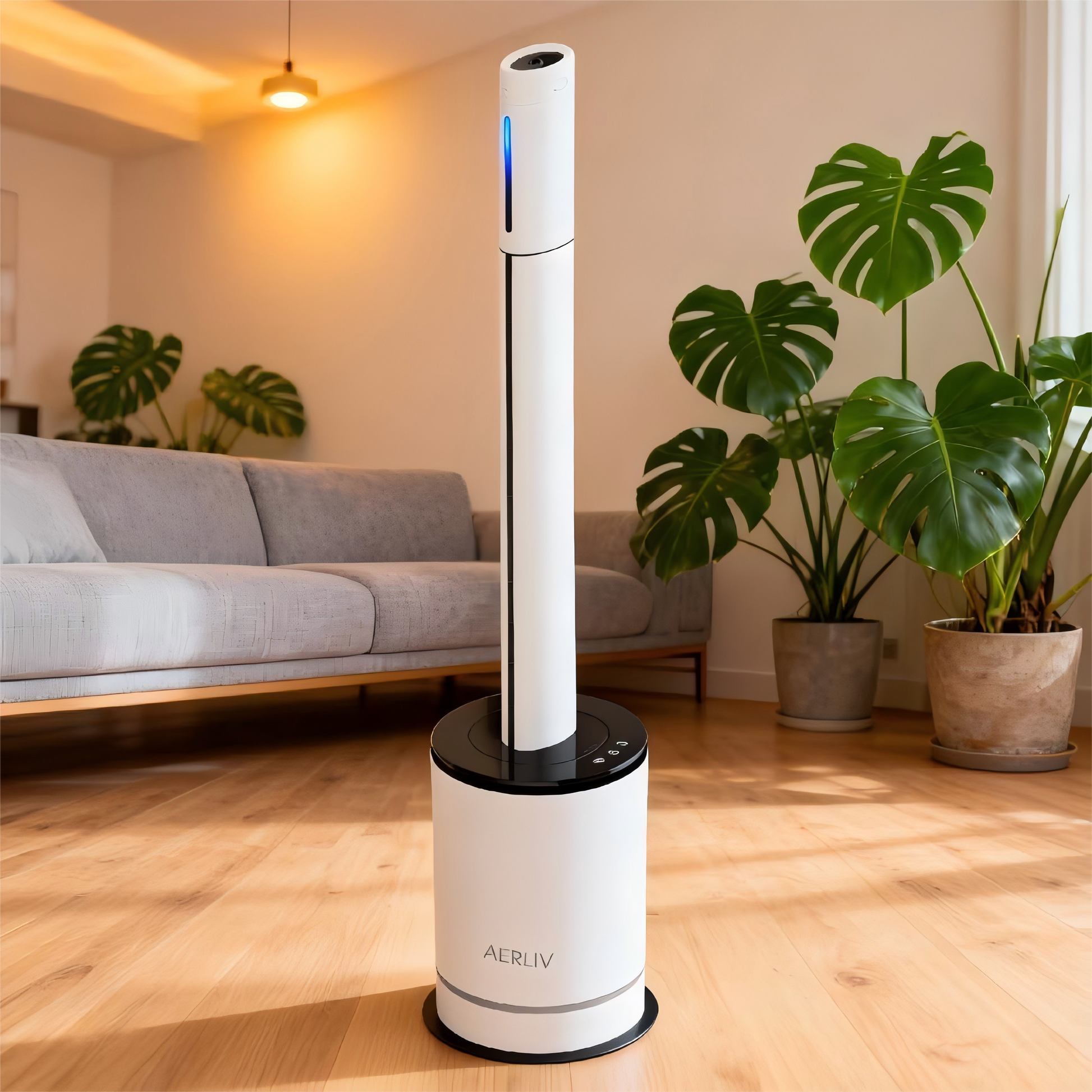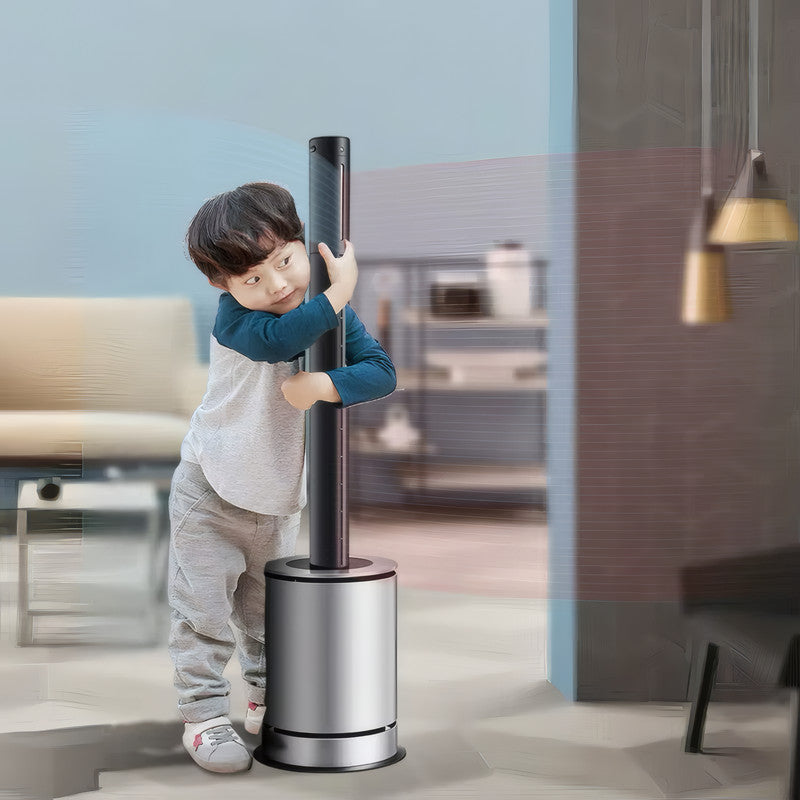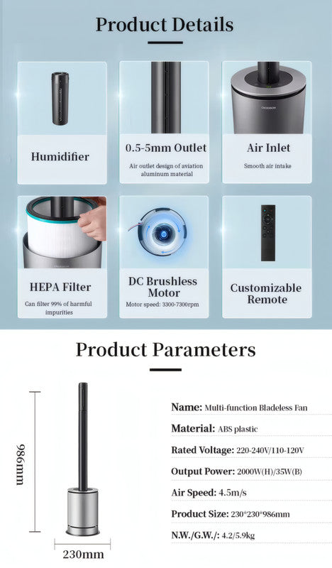 Experience year-round comfort with this versatile 4-in-1 bladeless fan, combining cooling, heating, air purification, and humidification. The built-in lithium battery allows up to 7.5 hours of cordless operation when using the humidifier. Equipped with a DC motor and invisible blades, it’s safe, quiet, and easy to clean. Features include HEPA filtration, UV sterilization (optional), oscillation up to 80°, aluminium air outlet, 1–9 speeds, sleep/strong mode, timer (1–8h), remote control, digital display, and touch-sensitive panel. Smart home compatibility (Wi-Fi/APP) and voice control via Echo/Google Home are optional. Safety features include automatic shutoff when tipped over and ambient temperature protection for heating.